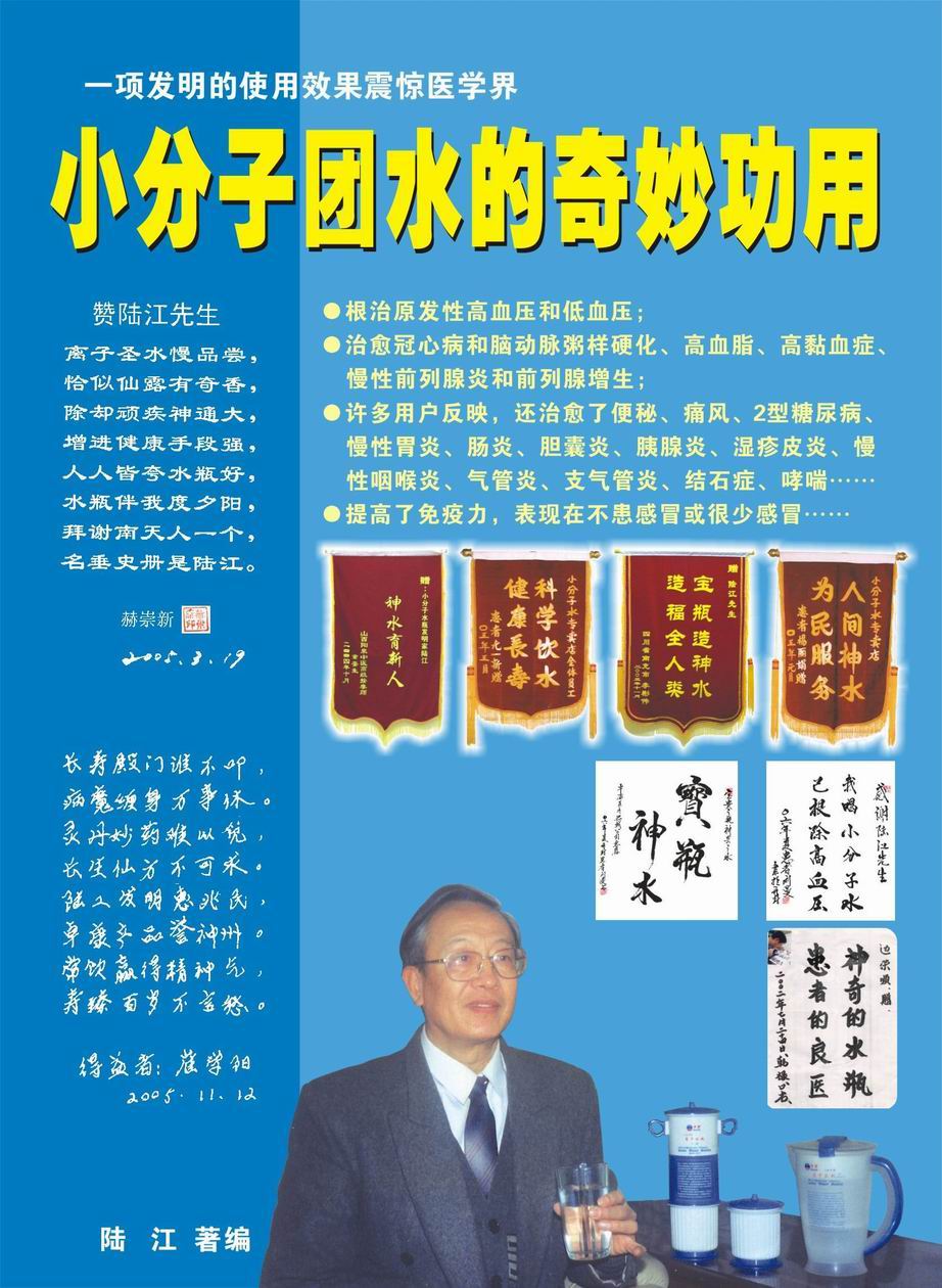 人類幾千年來患以上病癥需終生服藥,幾十年也不能治愈??墒俏覈蠈幍母呒壒こ處熽?nbsp;江,于1990年想根治高血壓,研究發明了離子水瓶,處理出微小分子團水供飲用,經過醫院臨床試用和專家鑒定,1999年獲中國發明專利權,產品于2000年投放市場后一直跟蹤調查,據全國各地用戶反饋:祛除了高低血壓、糖尿病和冠心病,并使前列腺增生、咽喉炎、鼻竇炎、慢性氣管炎、支氣管炎、矽肺病、哮喘、慢性胃炎、腸炎、慢性膽囊炎、慢性腎炎、腎衰、膀胱炎、便秘、痔瘡、風濕性關節炎和濕疹皮炎及中風后遺癥等病癥不藥而愈。為什么喝微小水能治20多種病?陸 江從1991年德國科學家發現細胞膜水通道僅為2納米獲得啟發,認為多種器官患病是因細胞脫水,不能正常代謝和分裂增殖,才使器官細胞減少致衰弱萎縮而形成細胞缺水性病癥。22年來的實踐有力地支持了“細胞脫水致病”這一重要論點,表明喝微小水可滿足細胞的生理需求,補水就能祛病,是生命科學新亮點。